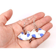 La collection Lucette est réalisée en fimo effet cuir, la fimo leather, très appréciée des polymèristes, au toucher très différent de la fimo classique. Elle est très souple après cuisson, ce n'est pas pour autant qu'il faut la plier. Pour cette série j'ai travaillé sur l'idée de la technique terrazzo, des petits morceaux de pâtes aux couleurs assorties que l'on dispose de façon harmonieuse sur un fond, j'ai été étonnée du résultat, qui donne un effet " peau de vache bleue " ! Alors pourquoi pas ? La collection est donc assez minimaliste.